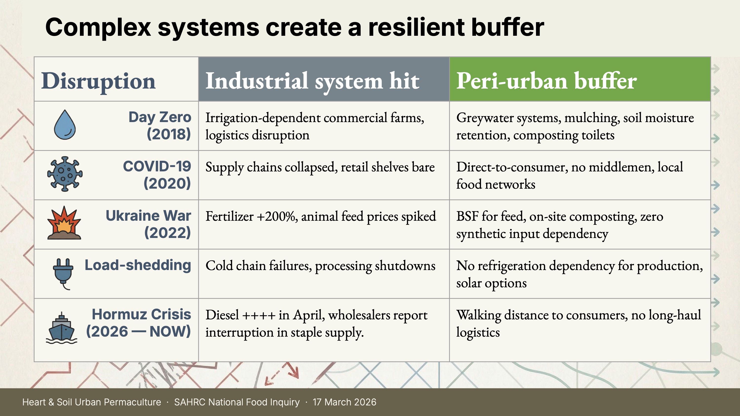 If your household can be embedded in community, with dozens of systems feeding into each other, it will absorb shocks differently. Because it assumes that there will be disruptions. This is something we tried to say at the SAHRC hearings. Disruptions are not going to become less frequent. They are likely to become more common.