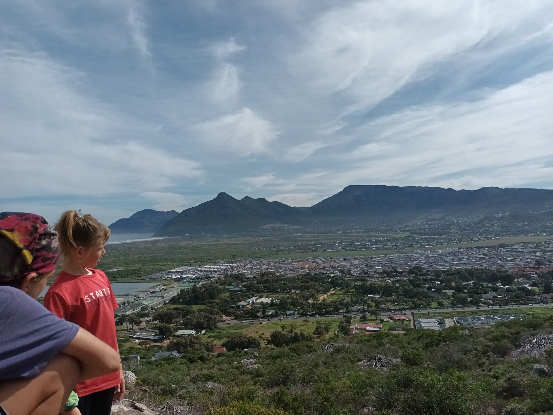 Up the mountain next to our house, looking down our neighbourhoood, with our kids and our neighbours’ kids.